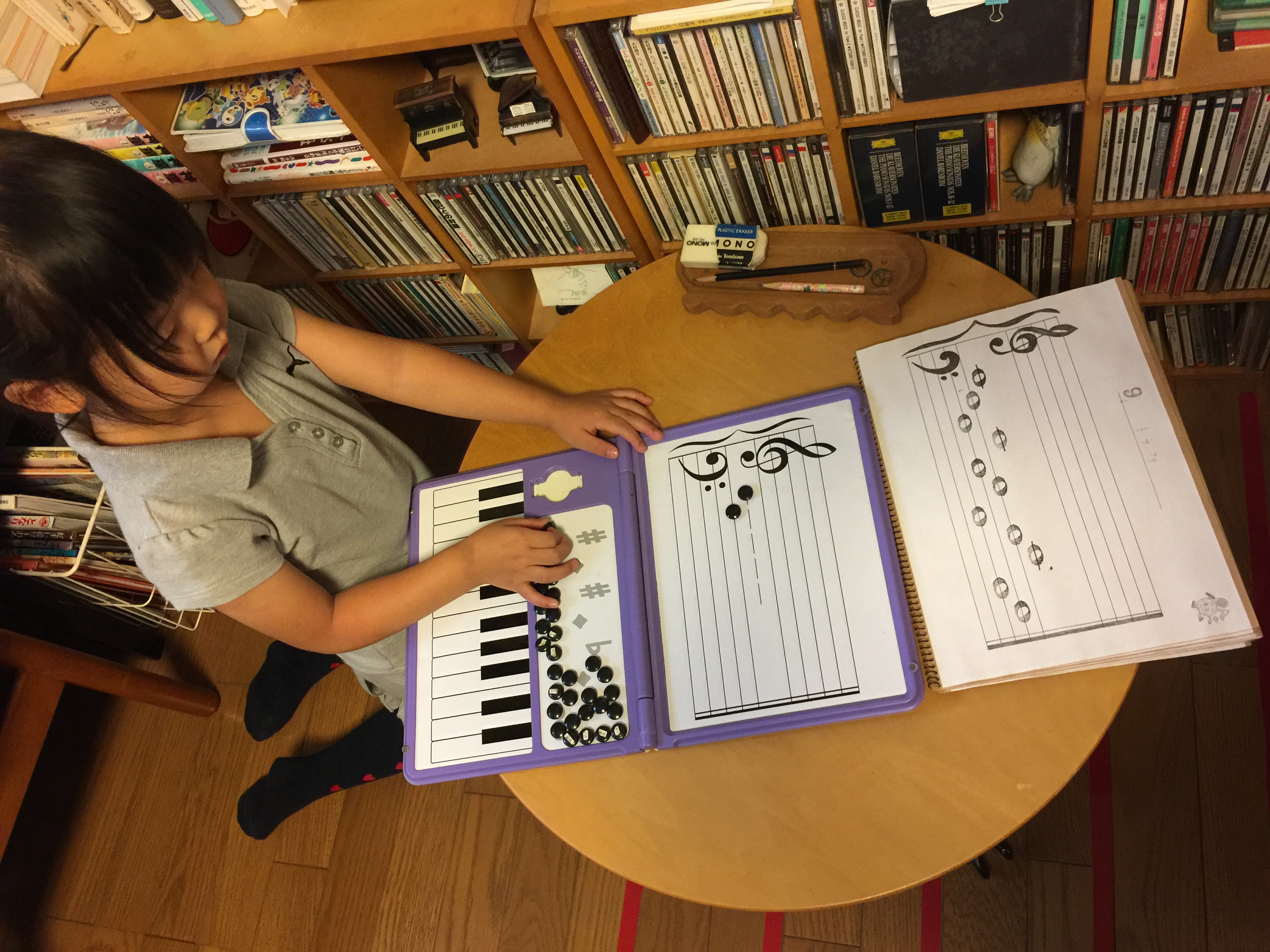 就学児童であれぼ、音符ドリルをやります。このドリル、B5サイズのものですが、そのままだと上の方の答えをみてかいてしまうので、一段ずつカットして束ねてから解いています。