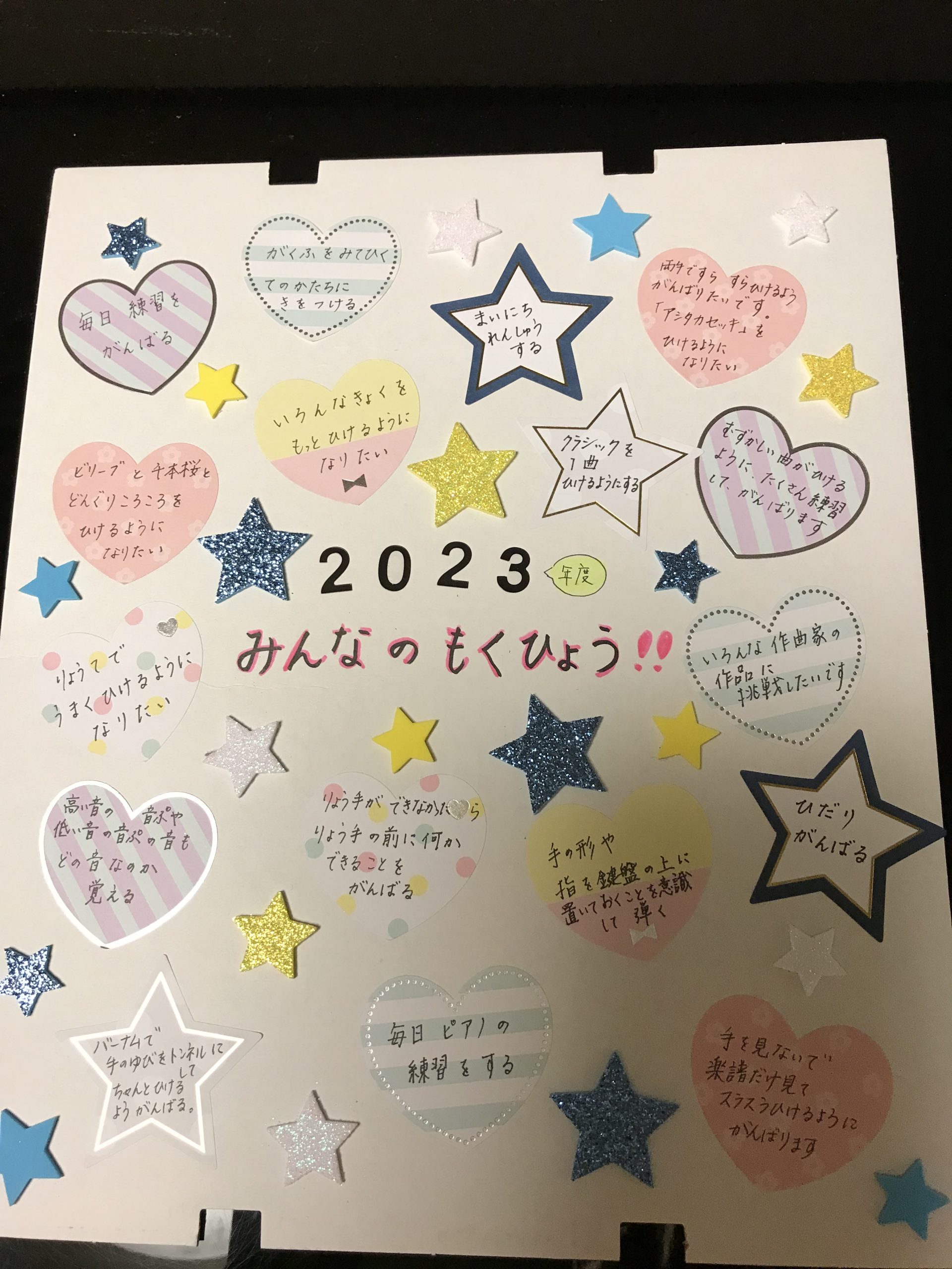 とてもシンプルに一行の人から、具体的にこの曲を弾く!というものや、結構長文で気持ちを書いていた人、普段レッスンで言われていることが目標になっている人もいましたし、一人一人の目標を目にしながら、嬉しく思いました。